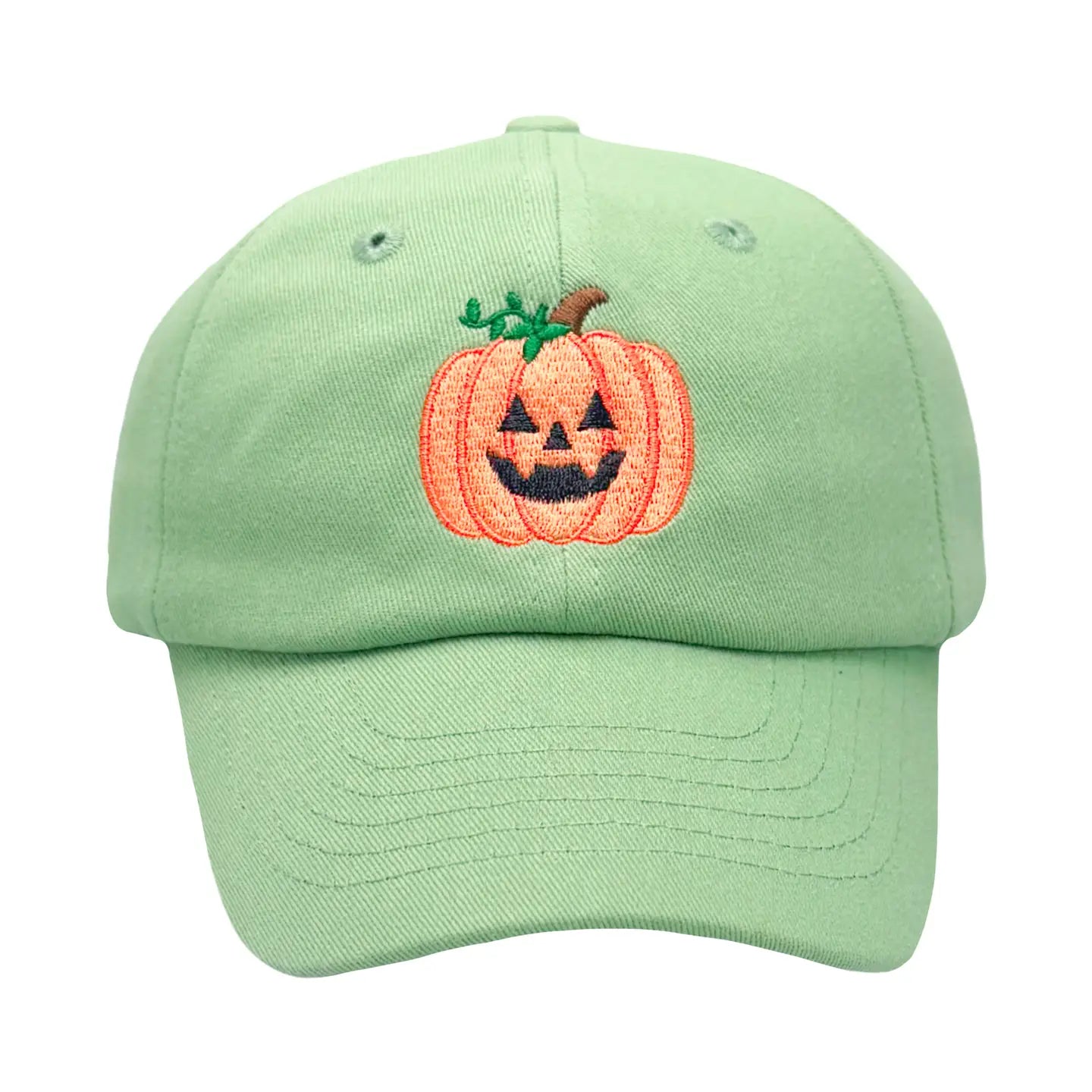 Light green baseball hat with jack-o-lantern embroidery to celebrate Halloween spirit in a fun, functional sportswear staple. * Soft-structured 6-panel baseball hat * Tuck strap with metal slide closure * 100% Cotton * Youth-sized cap fits most children from ages 2-7 years old
