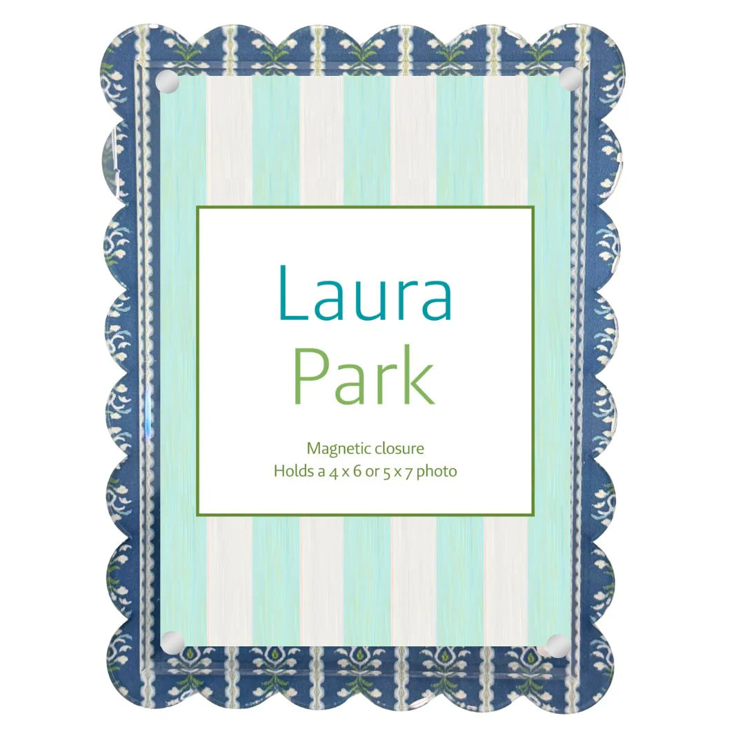 Highlight favorite photos with a stylish acrylic picture frame. Featuring our Rosemary Indigo print and a chic scalloped edge, this magnetic acrylic frame displays photos and keepsakes while adding a rich pop of color to desks, shelves, and bedside tables.