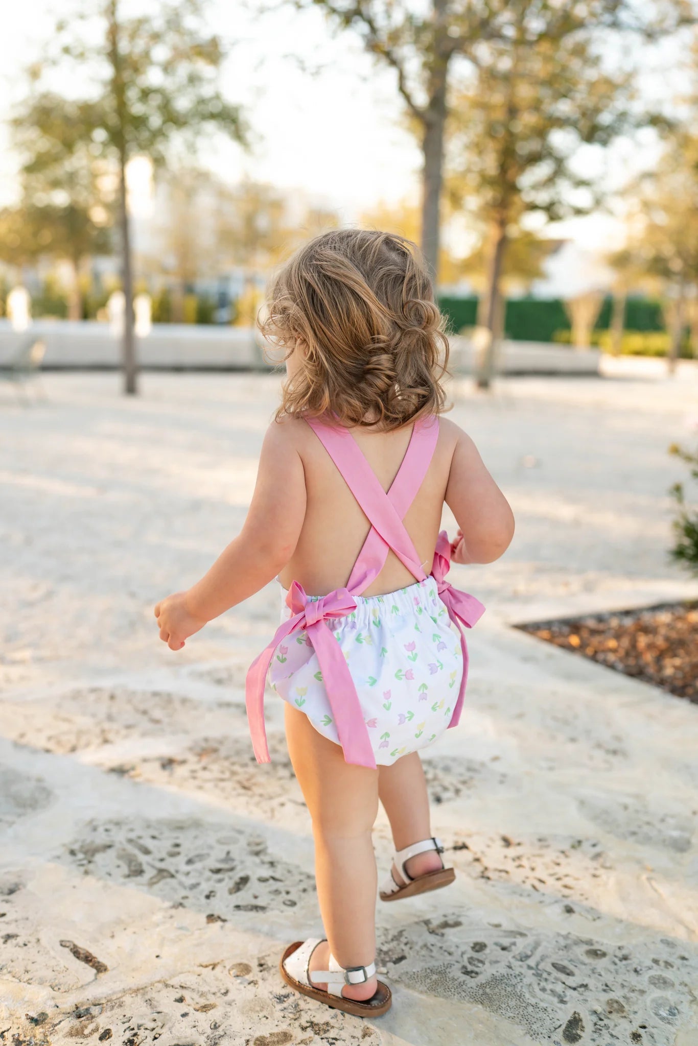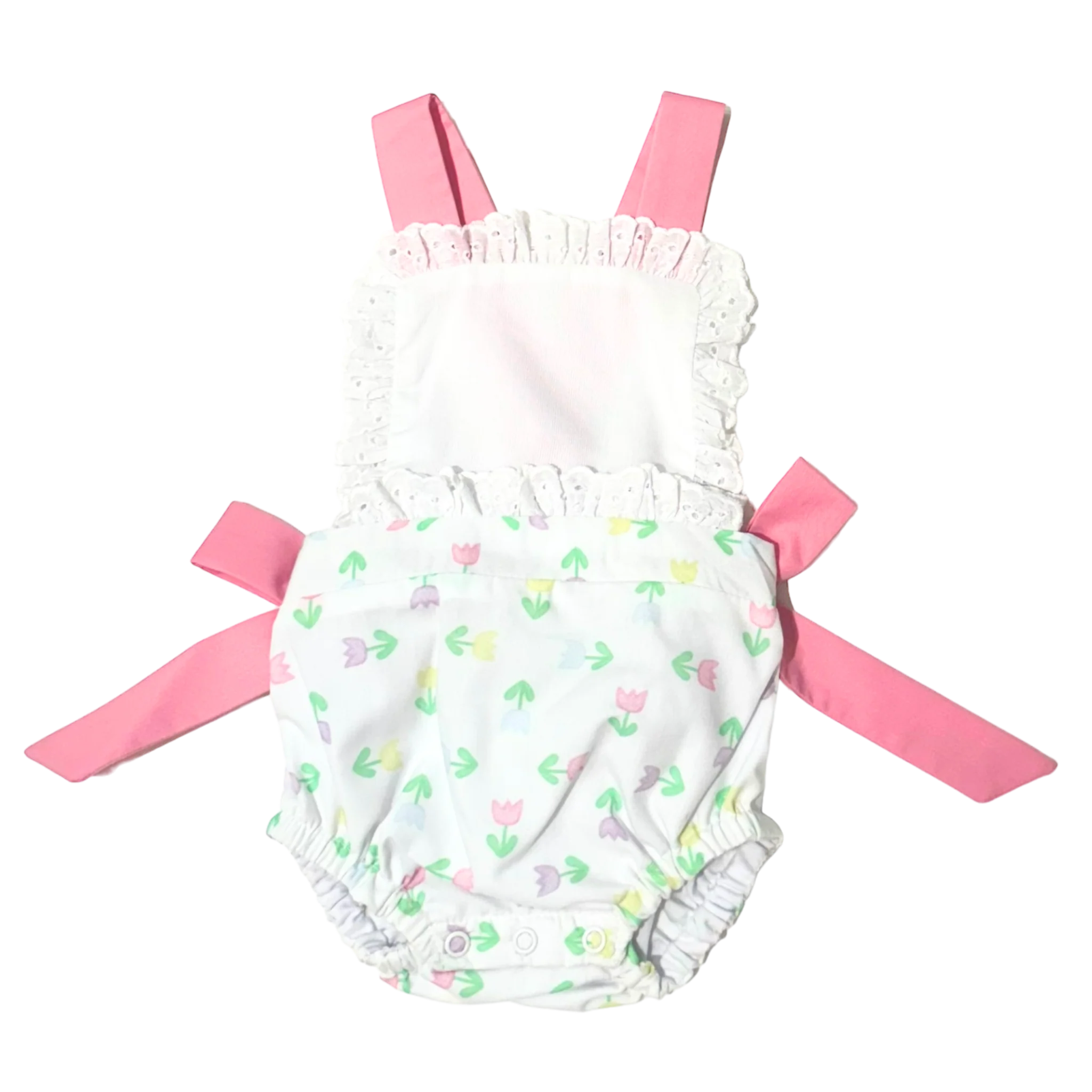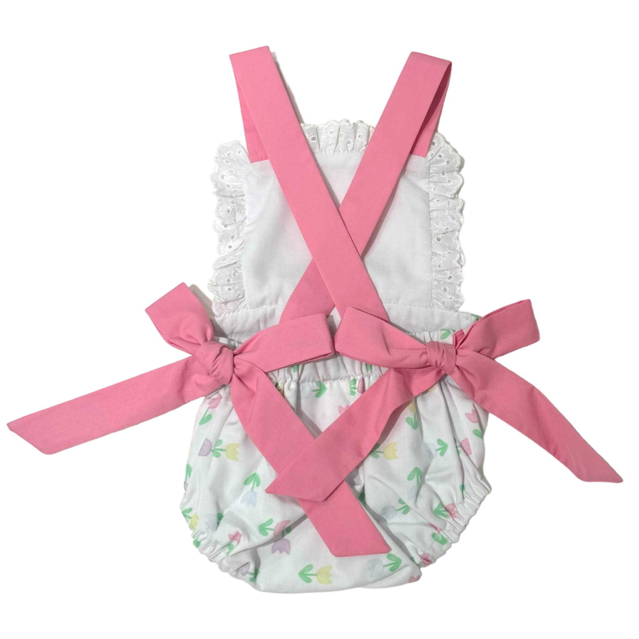 The Sadie sunsuit is back and better than ever! This Sadie features a white pique bib trimmed in white eyelet lace with our exclusive Rail Trail Tulips print that was painted by Whimsy Bay founder and designer, Talah, inspired by vintage floral interiors. The ties and bows coordinate in hot pink. This one is such a classic beauty, and the embroidery options are endless!