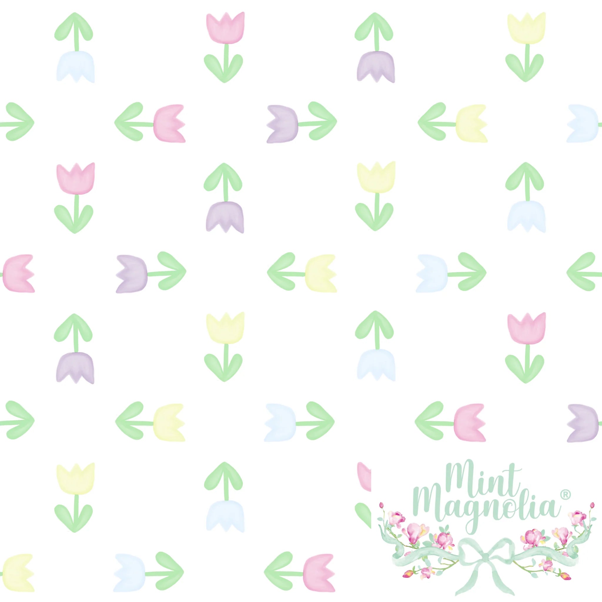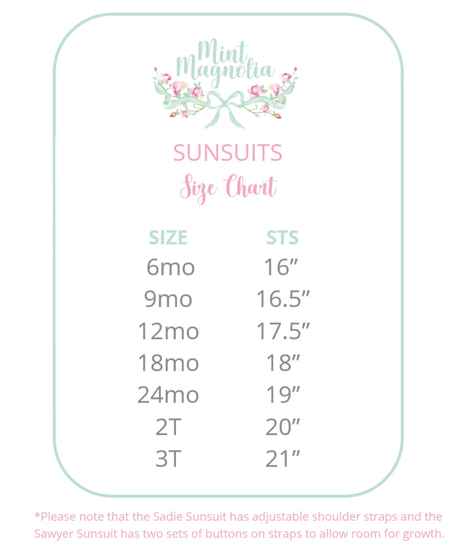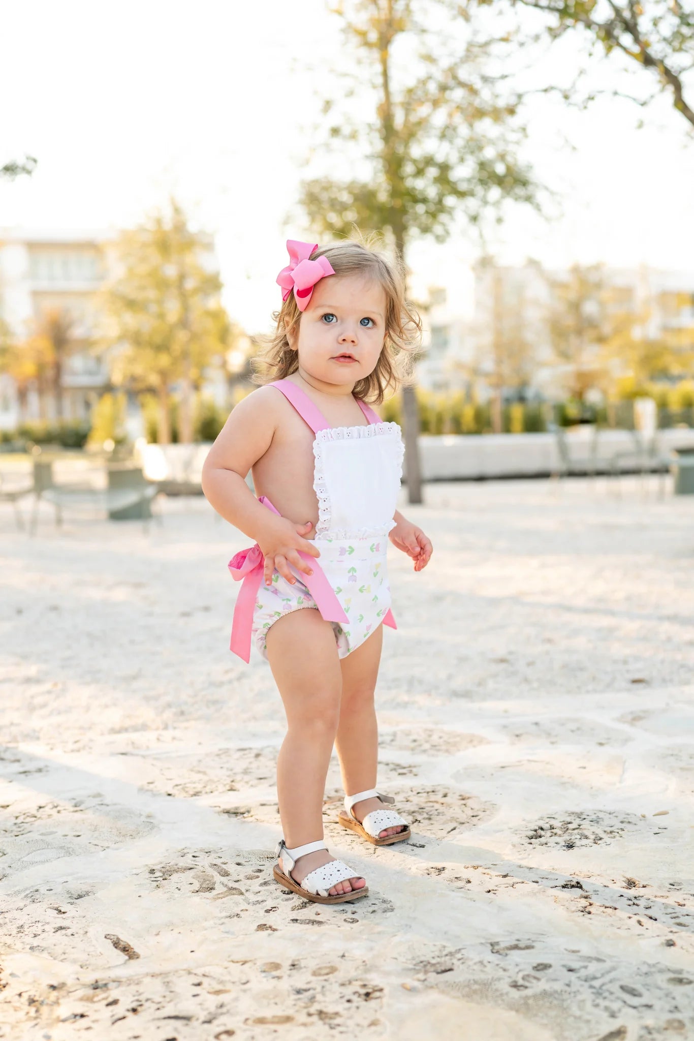 The Sadie sunsuit is back and better than ever! This Sadie features a white pique bib trimmed in white eyelet lace with our exclusive Rail Trail Tulips print that was painted by Whimsy Bay founder and designer, Talah, inspired by vintage floral interiors. The ties and bows coordinate in hot pink. This one is such a classic beauty, and the embroidery options are endless!