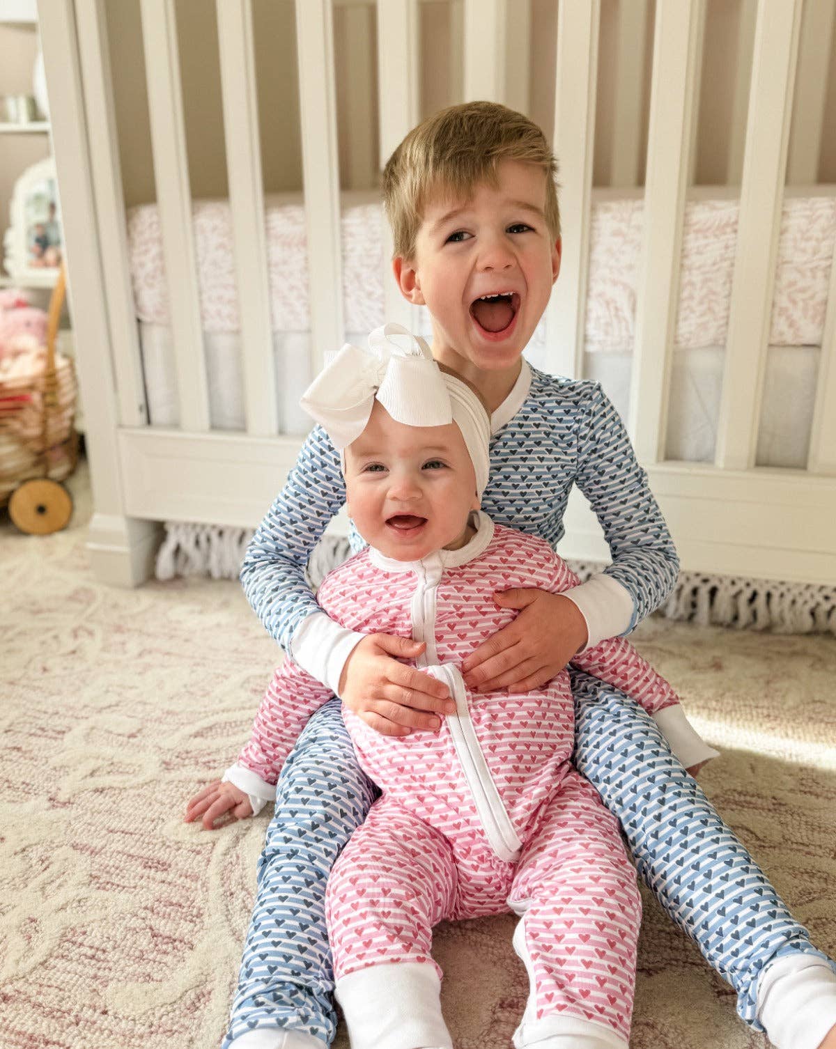 Our Sailor Heart Stripe print is a combination of two of our favorite things - stripes and hearts, because who doesn't love a bit of print on print? Our kids two piece pajama in our cute new blue heart stripe print will help fill hearts with love this Valentine's Day and beyond.