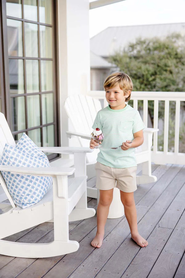 Our Sheffield Shorts in Keeneland Khaki with Keeneland Khaki Stork are preppy and practical! The elastic waist makes diaper changes and potty training so much easier, and you'll love how put together he looks. Pair them with any of our Prim & Proper Polos or Carter Crewnecks for a classic and charming outfit!