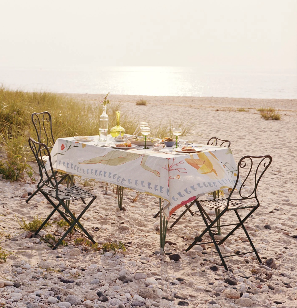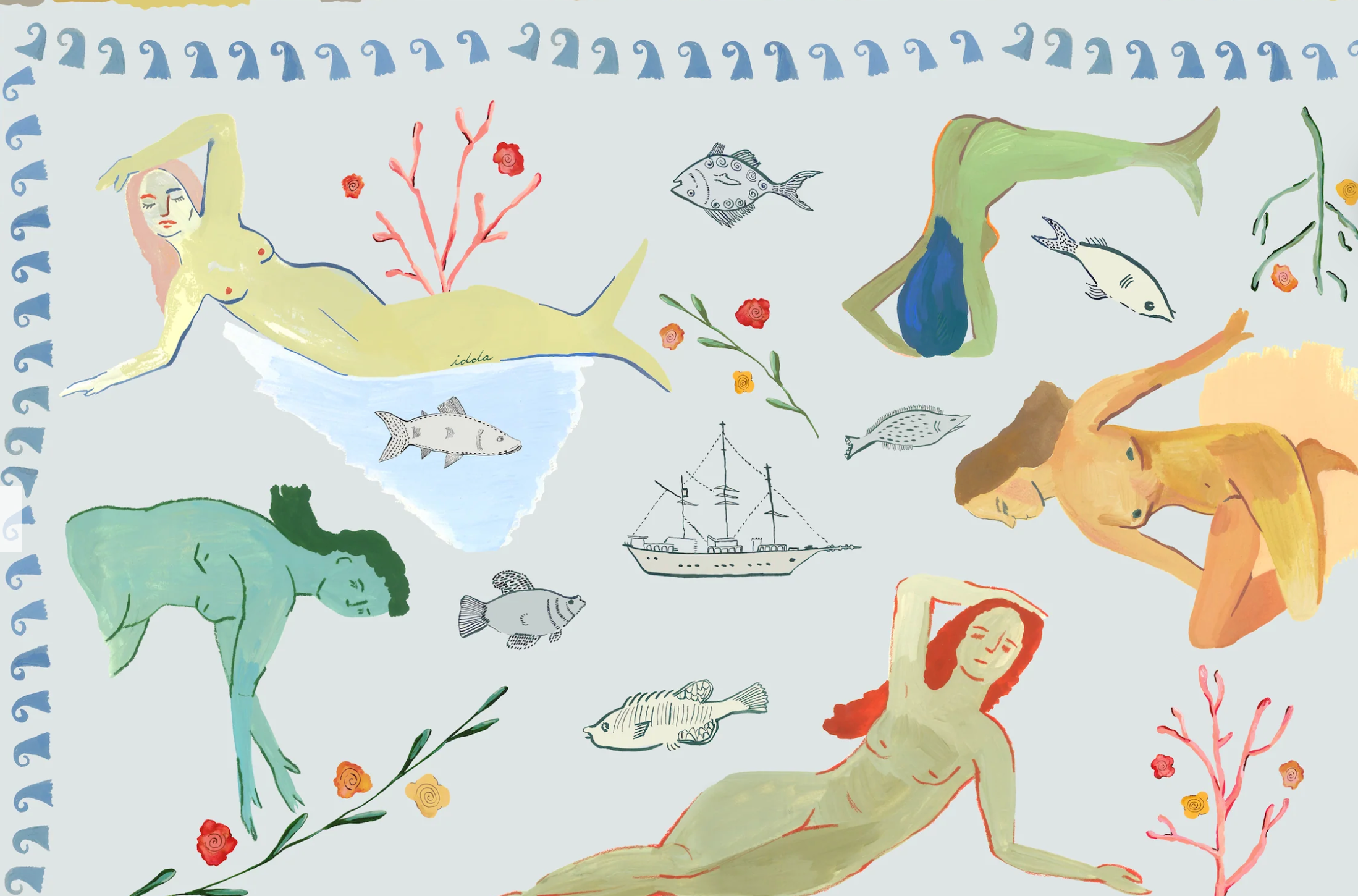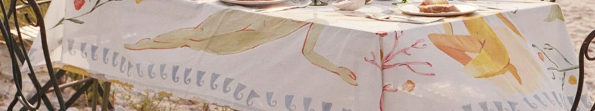 The Sirene Tablecloth is part of our newest collection of tableware inspired by the tale of the Sirens, most famously noted in Homer's Odyssey. The Sirens are a mystical female creatures and the collection depicts a vivid imagination of this tale while combining the mood, motifs and colors of Sicily.