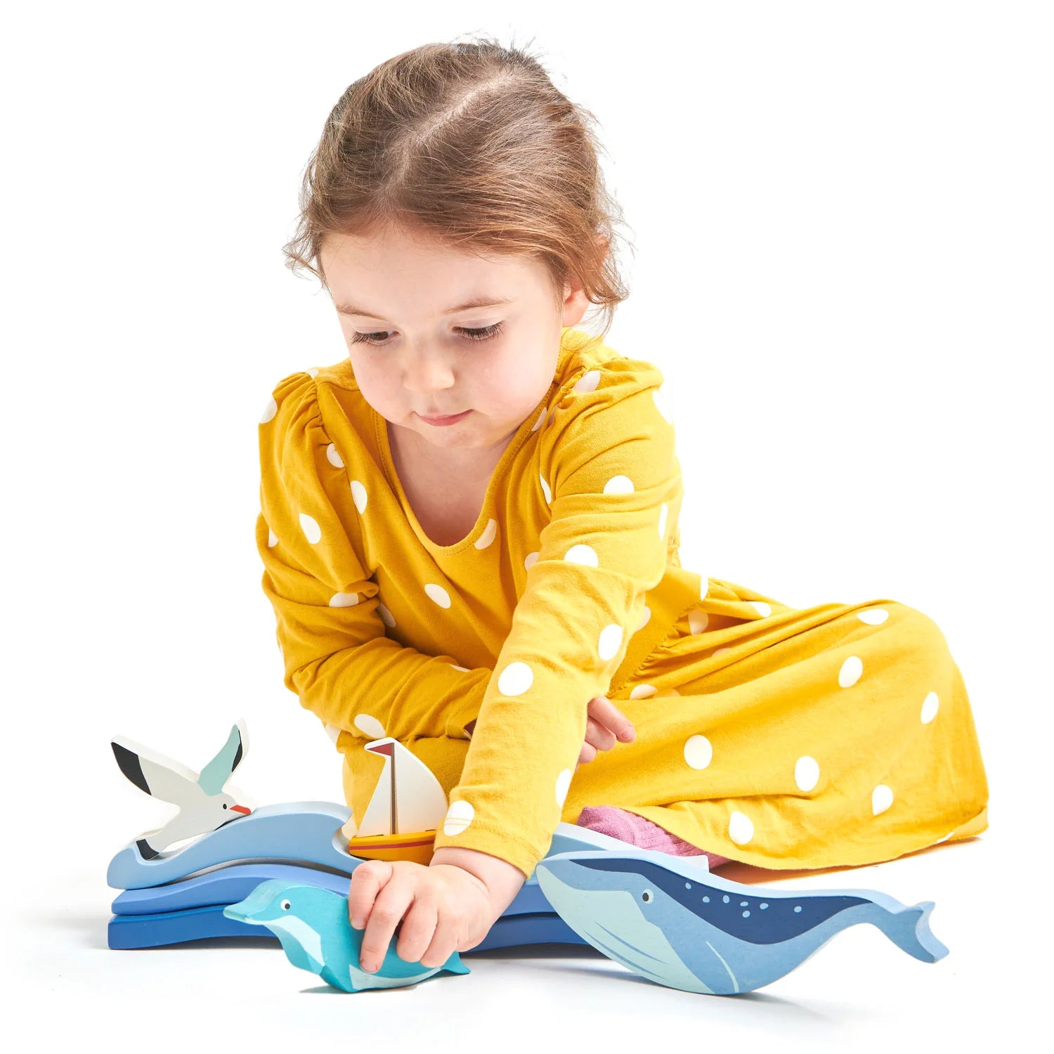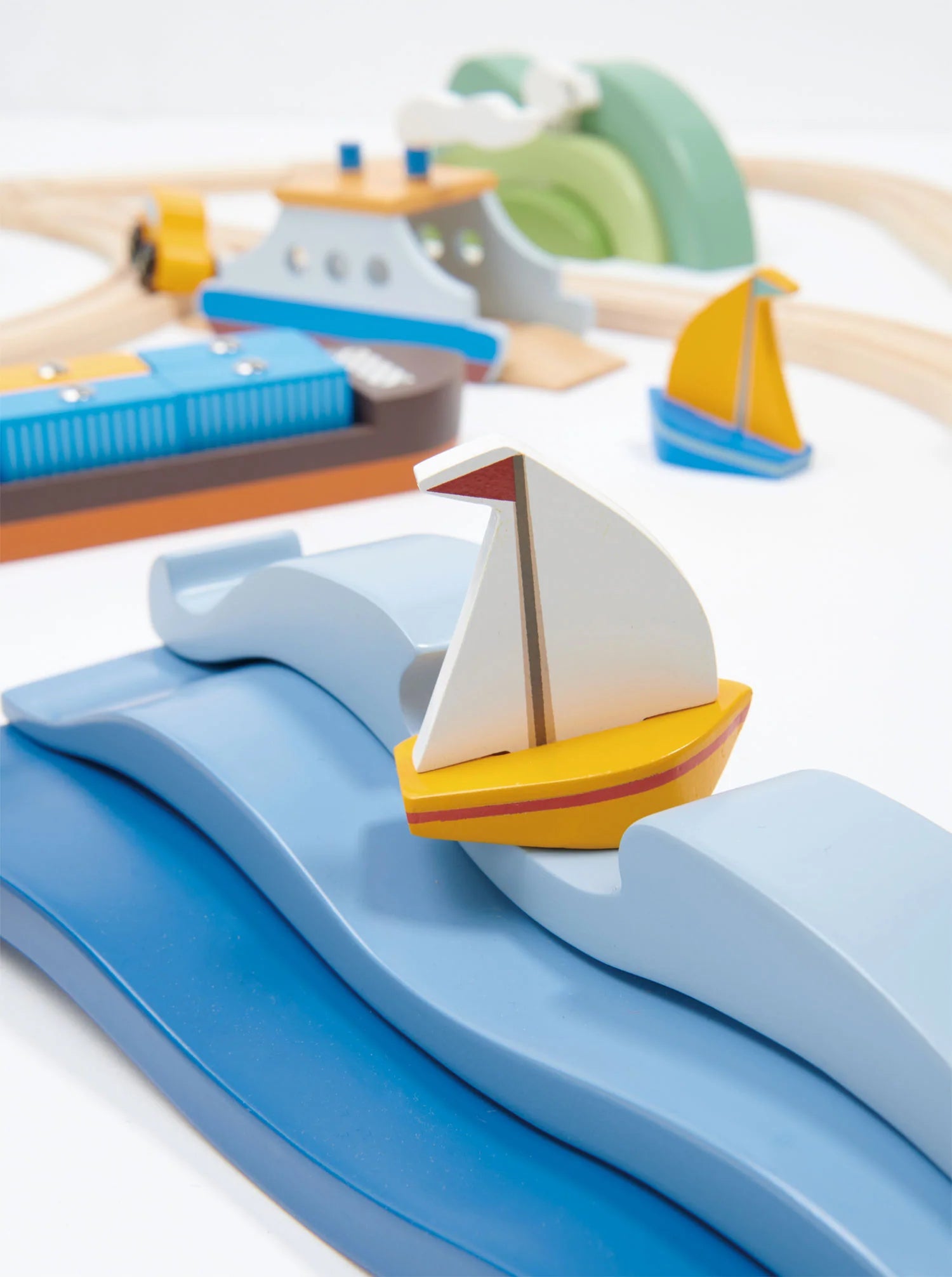 Perfect for displaying your sea creatures, three blue solid wood waves can be used as part of open-ended play. Including a little sailboat.