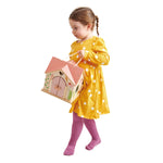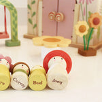 The cutest woodland cottage you ever did see. With a rose colored gabled roof, opening front doors and a removable back panel, this little house can be carried to be played with anywhere. Decorated on all sides with beautiful wild flowers, and two cut out windows which allow the flower stems to run through creating a magical meadow look. The back panel lies flat to become a garden, on to which can be placed a pretty swing, 2 flowers, and a toadstool. We have included a wood burning stove, flower table, 2 button stools, a toadstool lamp and a side table. Tuck Bud up in his leafy fabric bed, or push Corny on the swing while mummy Flora and Daddy Joey watch the stars go by.