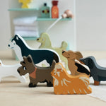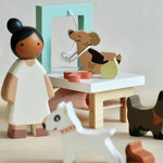 Welcome to the Waggy Tails dog grooming play set, where our lady groomer cares for and pampers 7 different breeds of dogs. Breeds include: Giant Poodle, Husky dog, Beagle, Bull Terrier, Dachshund, Shih Tzu, and Scotty dog. Included in the set is a washing area with shower head and three towels, a grooming table with brush, a self-standing back wall with plug in hair dryer and clippers, 3 bottled dog products and a winning trophy, 3 podiums to display the groomed dogs, a blanket, 2 bones in a bowl, and a little poo! Scaled to our dolls house world, combine with our other pet sets and dolls for extensive imaginative playtime.