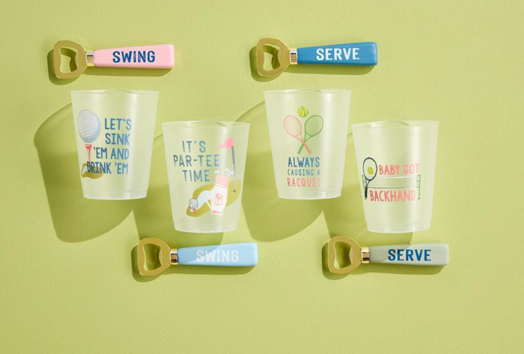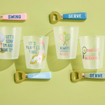 Plastic Cups wrapped with a bottle opener topper twisted at the top! A 2-piece set.