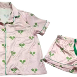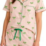 The set boasts a playful design with all-over kelly green tennis racquets on a light pink satin body, making it an ideal choice for a tennis-themed getaway or a thoughtful gift for any tennis enthusiast.