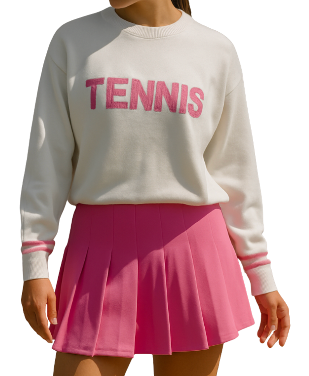 Elevate your wardrobe with our RA-designed crew neck sweater in cream. This essential piece features a lightweight, year-round weave, ribbed trim, and cuffs, and is adorned with embroidered lettering for a chic and sporty look.