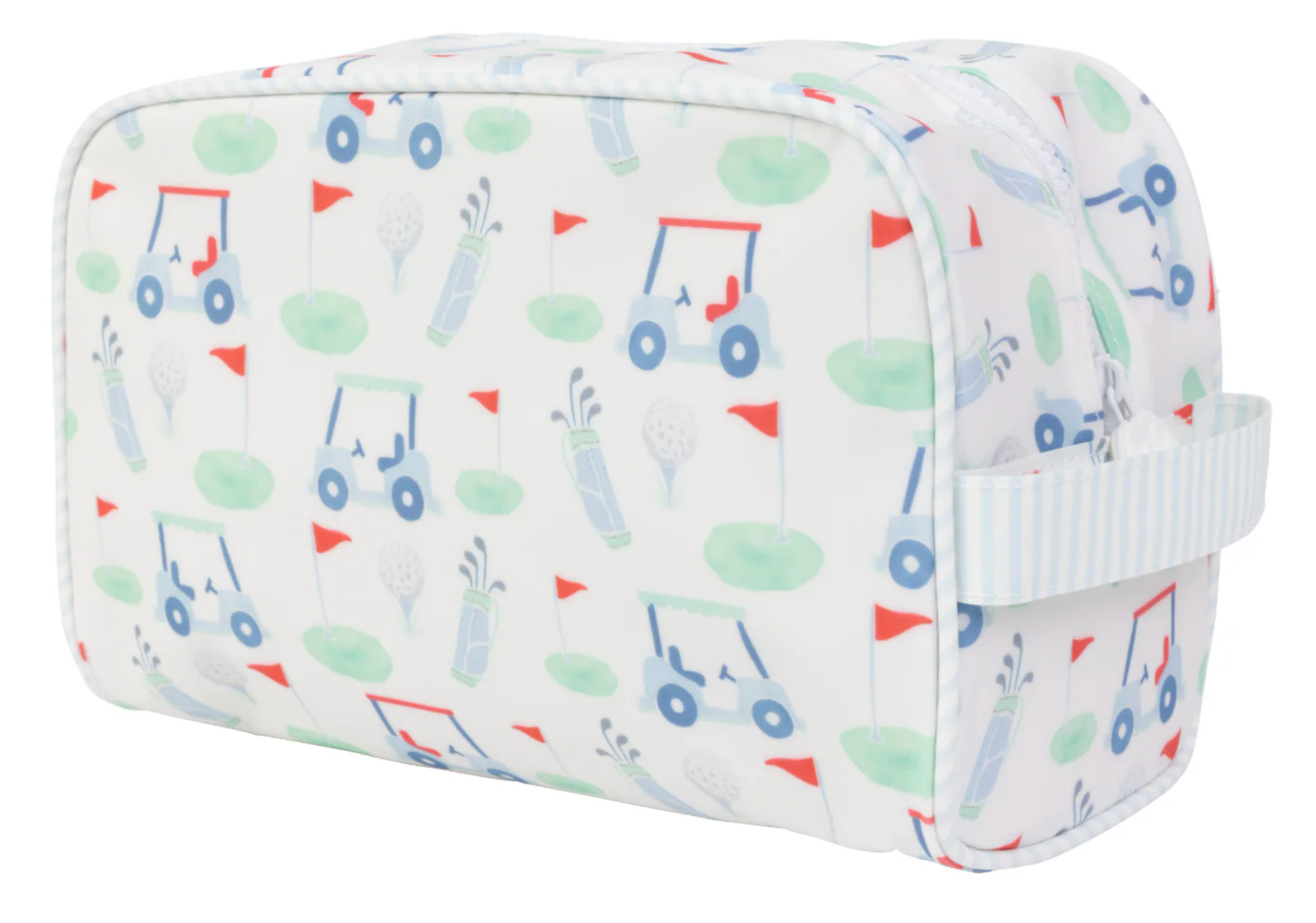 Coated, clean, and cute! The Dopp Kit is a must-have travel companion. Big enough to fit all of your travel necessities - toiletries, medicines, hairbrushes and bows, you name it! Inside you will find a mesh pocket to help you keep up with your smaller items.
