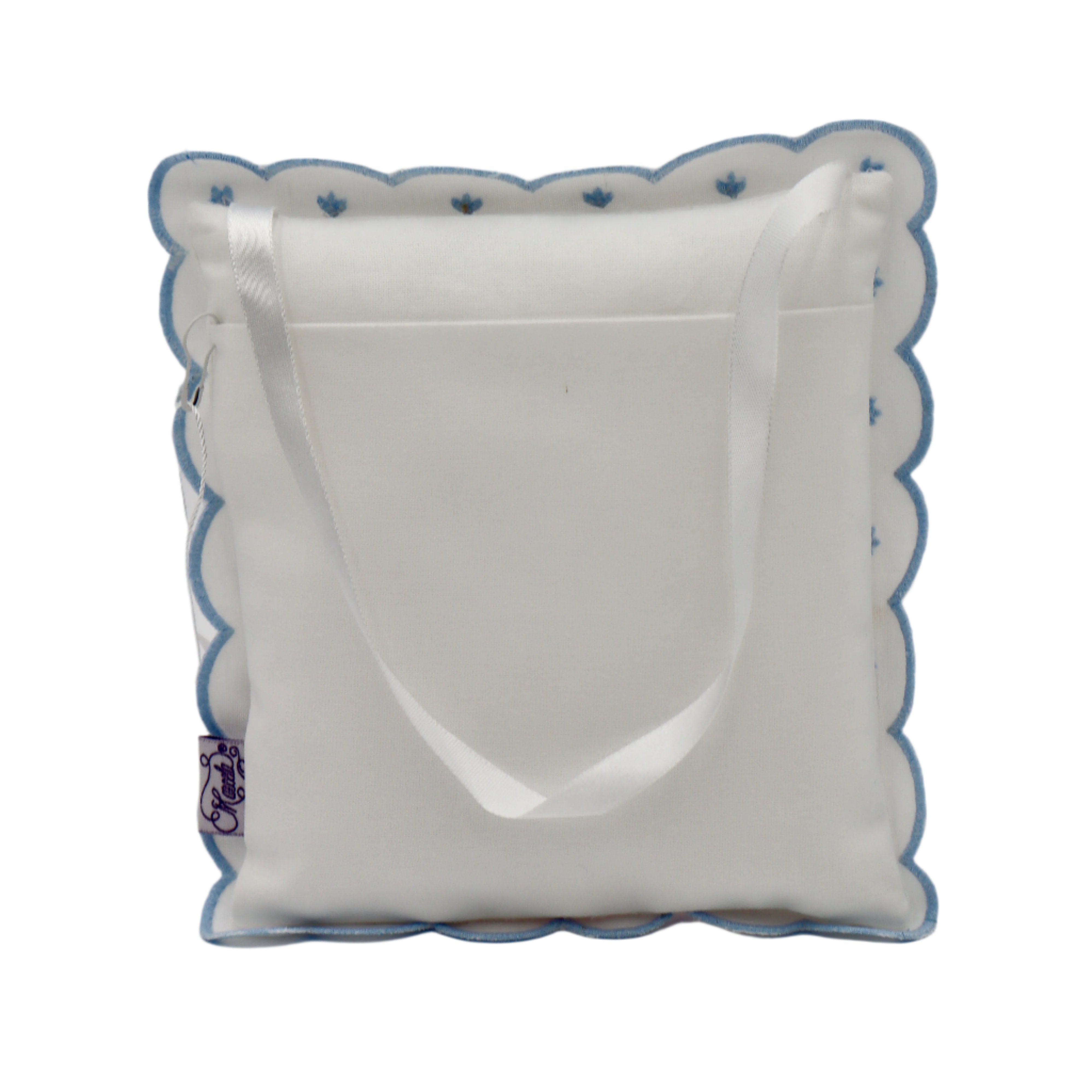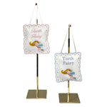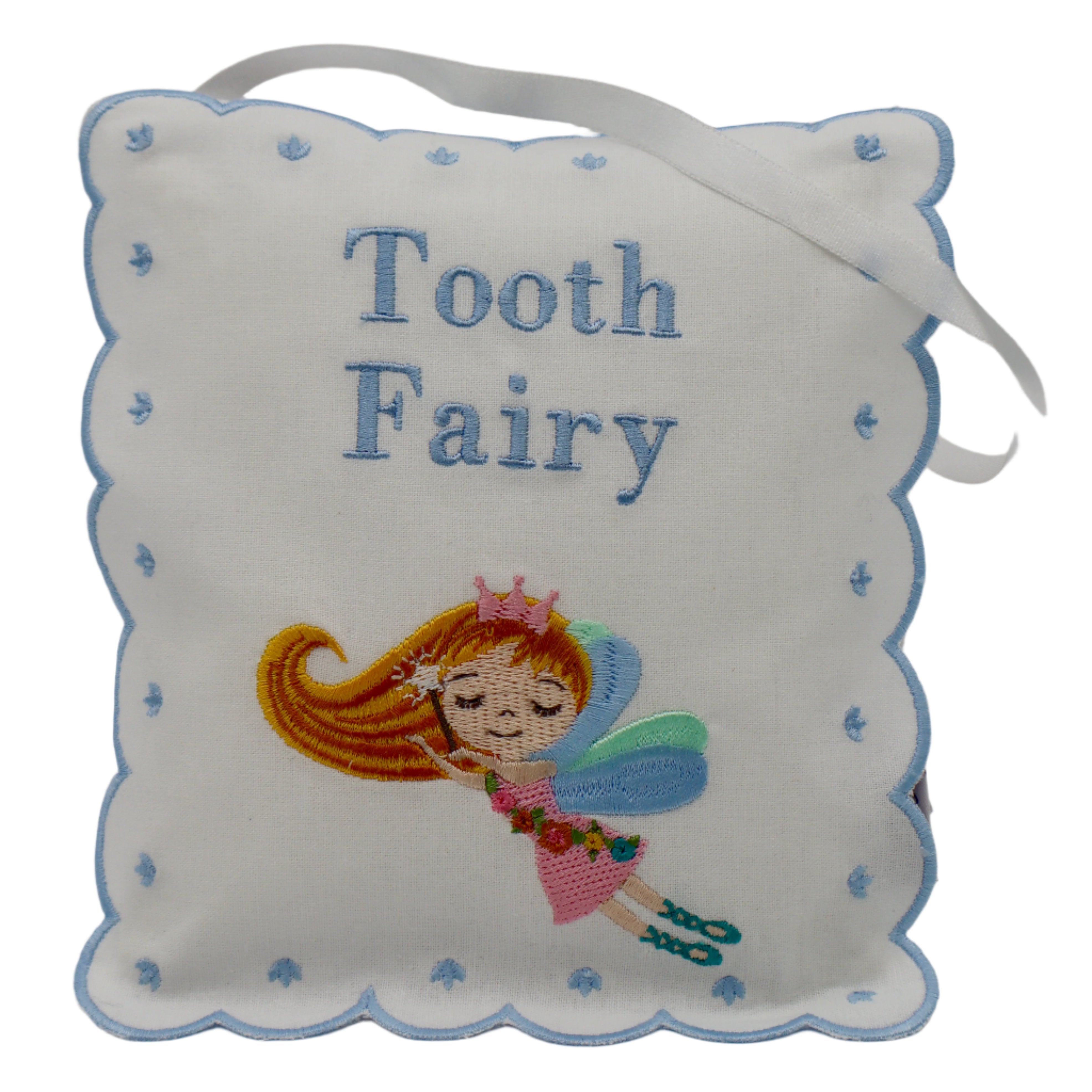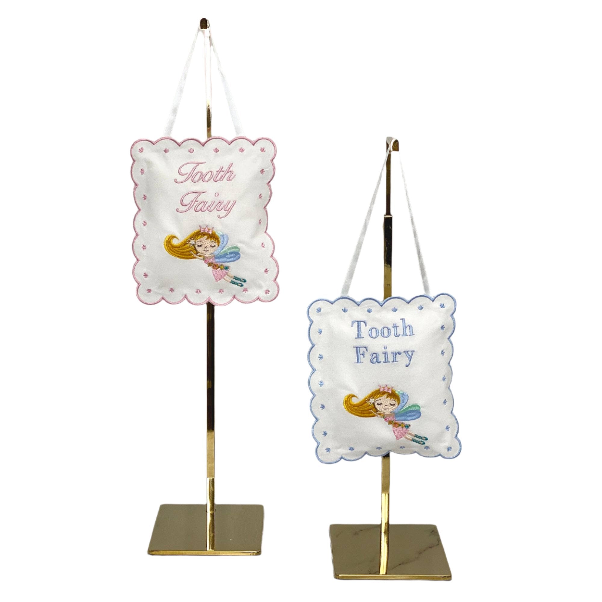 Let the tooth fairy know that your baby is waiting for her with this tooth fairy sign pillow. Made of white cotton linen, ultra-soft pillow fillers, embroidered design, custom made and a scalloped edge. This hanging sign also has a pocket for tooth fairy gifts.
