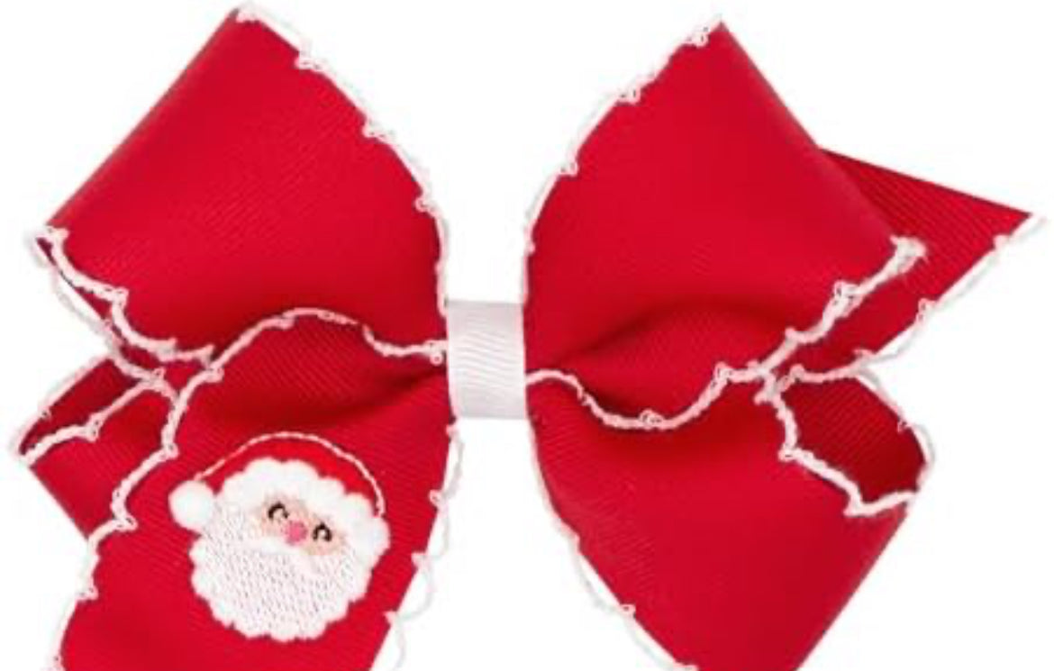 Holiday styles as sweet as her! These Medium grosgrain bows feature classic moonstitch edges and new for Santa themed embroidery styles. Perfect for meating Santa and any Holiday party. This bow is sure to stay in her hair all day with our patented WeeStay™ no-slip hair clip.
