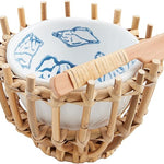The woven rattan holder brings a rustic and natural feel, while the rattan wrapped wood spreader is perfect for spreading butter or dips. This set is perfect for serving small snacks or appetizers and is sure to impress guests at any gathering. Bowl 3" x 5 1/2" | spreader 5 1/2"