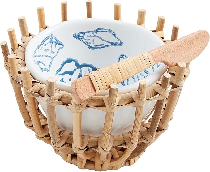 The White Sea Woven Tidbit Set is a delightful 3-piece collection consisting of a hand-painted ceramic tidbit bowl, a woven rattan holder, and a rattan wrapped wood spreader. Crafted from durable dolomite, this set not only looks beautiful but is also built to last. The ceramic bowl showcases intricate hand-painted designs, adding a touch of sophistication to any dining table.