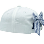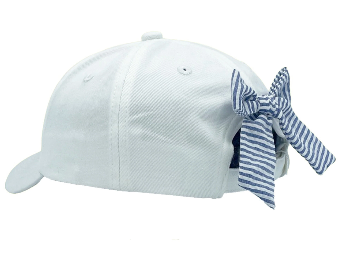 - Each Baseball Hat is adorned with a festive, blue/white seersucker bow